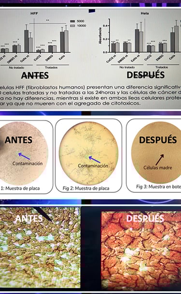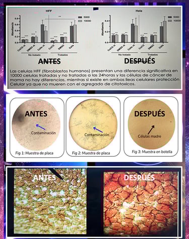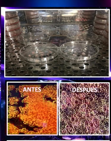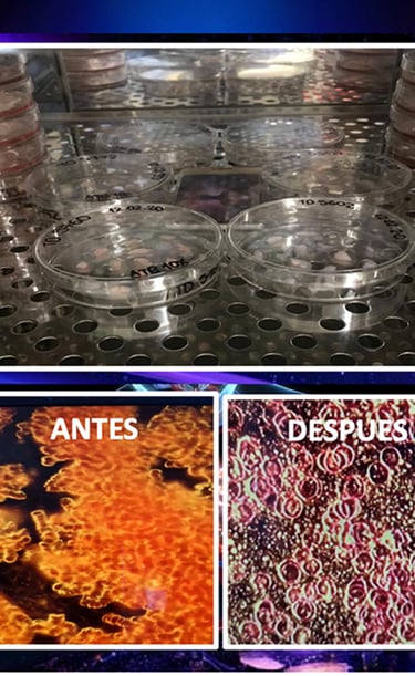 ✅ Erradicación microbiana en campos celulares contaminados y resistentes a antibióticos en menos de 15 días.
